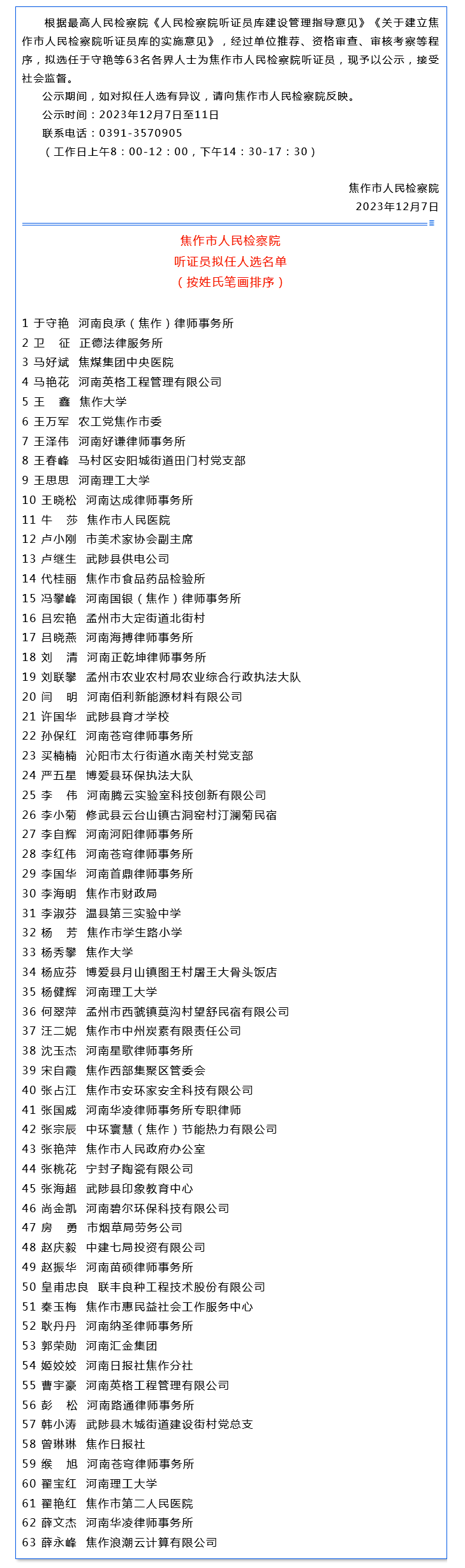 焦作市人民检察院听证员拟任人选公示